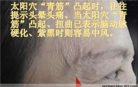 1.當太陽穴青筋凸起時,往往提示頭暈,頭痛;當太陽穴青筋凸起,扭曲時,表示腦動脈硬化;紫黑時,則容易中風。