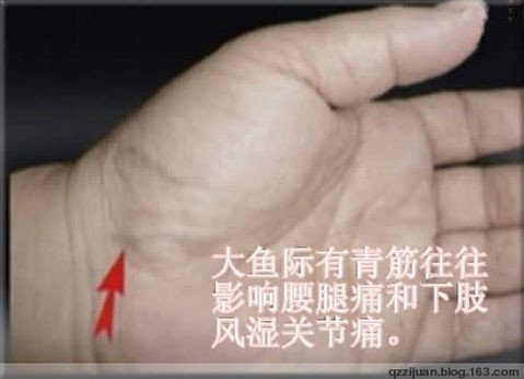 (1)大魚際有青筋,往往提示腰腿痛和下肢風濕關節痛。