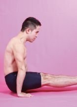 3.兩臂撐身:坐在床上或地毯上,腰背端直,全身放鬆,調勻呼吸。然後,躬身彎腰,頭向前低,兩手在身體兩側放在床上或地毯上,用力支撐起身體,同時盡可能肩背向上拱起,根據個人體力情況,反復做5~10次(圖3)。