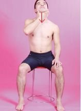 2.搓頸至胸:保持原有姿勢不變,上身挺直,下巴上抬使頭後仰,頸部伸展,拇指與其他四指分開,將虎口對準咽喉部位,從上向下按搓,直到胸部,左右手交替搓按40~60遍(圖2)