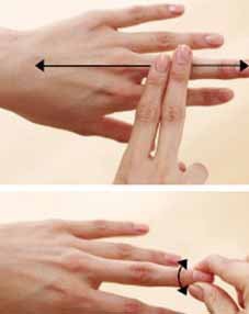 5、伸出左手中指,用右手的拇指與食指第二關鍵夾住中指指根,向指尖的方向輕輕拉中指按摩,令中指充分伸展開來。