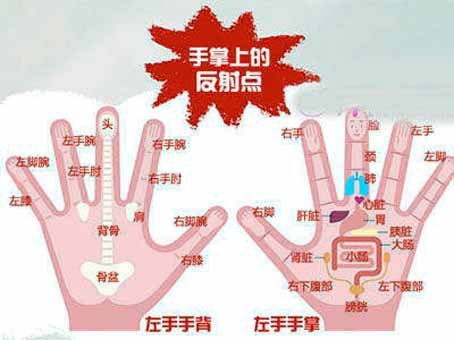 如上圖所示,手掌與手背都跟我們的內臟器官一一對應,只要我們適當地按壓這些反射點,就能調離相應的機能。另外值得注意的是,左右手的反射區是有區別的,即左手手背與右手手掌重合,左手手掌與右手手背重合。