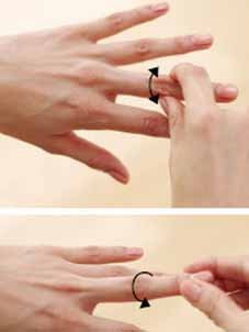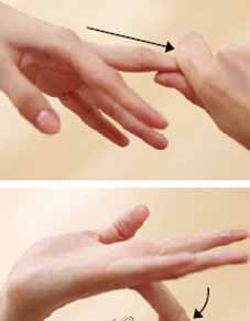 2、用右手的食指與拇指指腹夾著左手中指指尖,然後向中指的左右來回輕輕搖動第一關節20次,並邊進行呼吸。