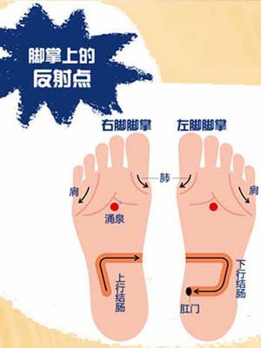 在我們的左右腳掌前半部分都有湧泉穴,與自主神經系統密切聯繫。另外,如圖所示,腸道在腳掌上也有相應的反射區,肺等呼吸系統位於腳趾下方的內側,肩部則在外側,對於消化與便秘問題可以通過按摩腳底來改善哦!