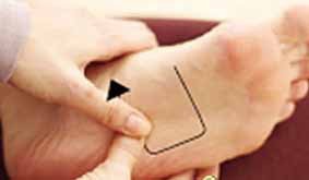 2、將右腳的腳掌架在左邊大腿上,按照大腸反射區的起點,即腳跟上方偏外側的位置開始,向前到達腳掌中央後,以直角轉向用拇指指腹按摩至內側,重複3次。