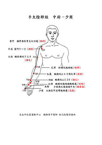 【主治】①咳嗽、氣喘、咳血、嘔血、胸滿、掌心熱、缺盆中痛、喉痺、乳部刺痛、噦;②無脈症;③腕臂痛