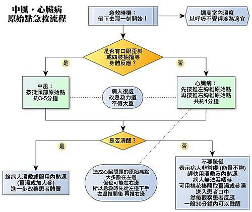 - 用 按 摩 或 刮 痧 方 式 刺 激 中 指 尖 端 , 百 會 穴 ( 頭 巔 部 兩 耳 尖 聯 線 之 中 點 ) , 涌 泉 穴 ( 足 底 心 前 1 / 3 處 ) , 令 病 者 盡 快 蘇 醒 。