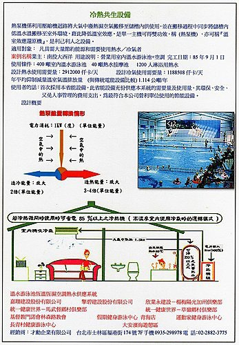 使用條件:400噸室內溫水游泳池 40噸熱水按摩池 1200人淋浴用熱水